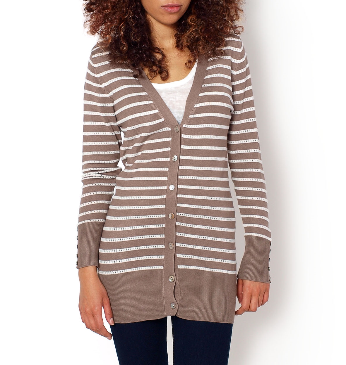 Kardigan/sweter w paski, zapinany na guziki, dłuższy fason, dekolt w serek, rękawy i dół zakończone ściągaczem, przy zakończeniu rękawów rząd kilku ozdobnych guzików.Materiał 65% bawełna, 35% poliester.Modelka wzrost 165cm, na co dzień nosi XS/S, rozmiar z prezentacji produktu uniwersalny (m/xl)