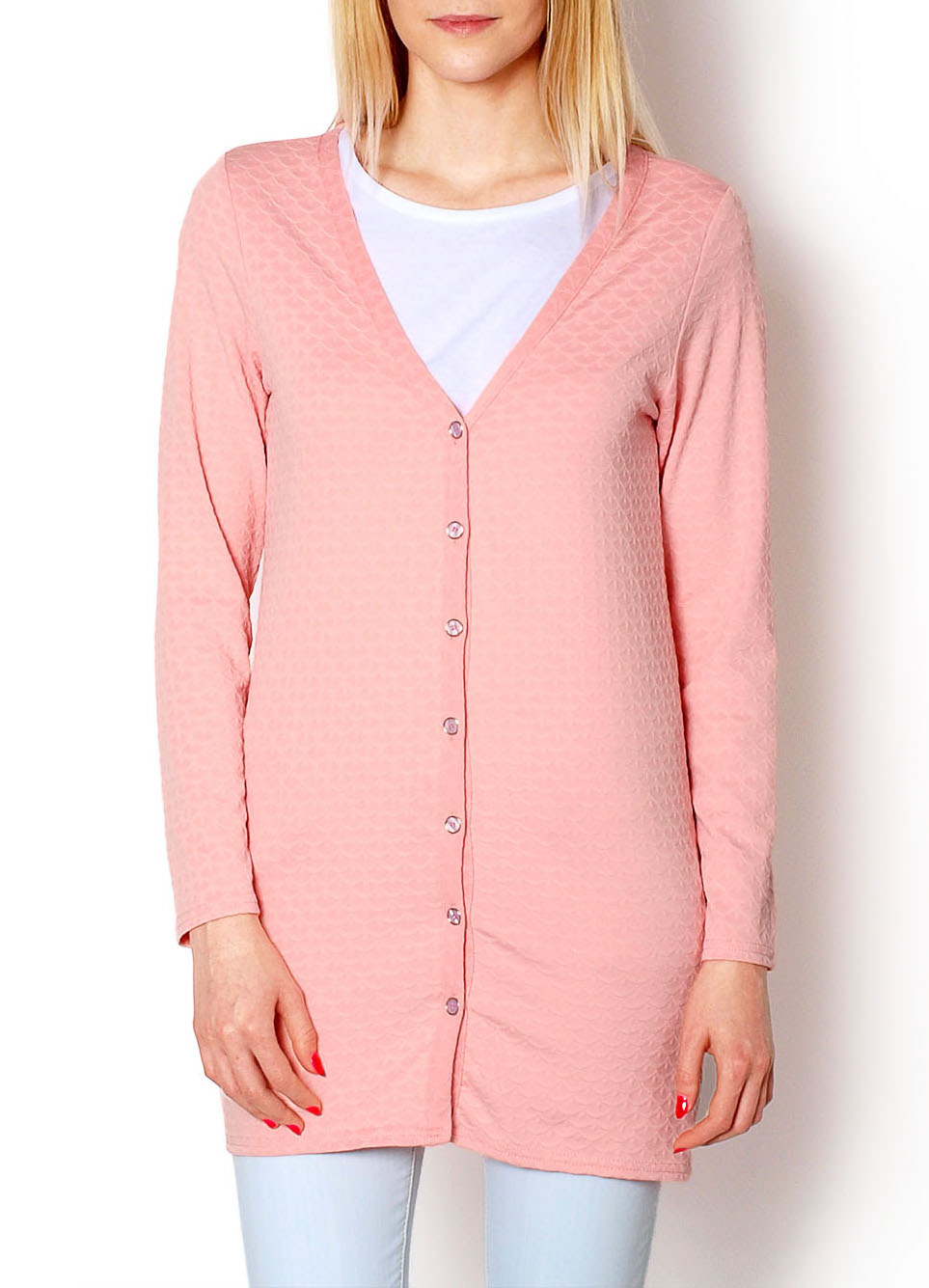 Rozpinany kardigan o wytłaczanym wzorze, długie rękawy, dekolt w serek, zapinany na guziczki.Materiał : 100% poliester.Modelka : 175cm, na co dzień nosi S/M, rozmiar z prezentacji produktu M/L.