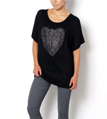 Luźna elastyczna bluzka, szerszy fason, przód ozdobiony cyrkoniami i perełkami w kształcie serca, dekolt okrągły. Boki na dole delikatnie drapowane i podszyte gumką. Materiał: 95% bawełna, 5% elastanModelka: wzrost 172cm, na co dzień nosi S/M, rozmiar z prezentacji produktu L