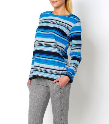 Bluzka/ koszulka długi rękaw, w paski, dekolt okrągły, luźniejszy fason.Materiał 65% bawełna, 35% poliester.Modelka wzrost 175cm, na co dzień nosi S/M, rozmiar z prezentacji produktu M