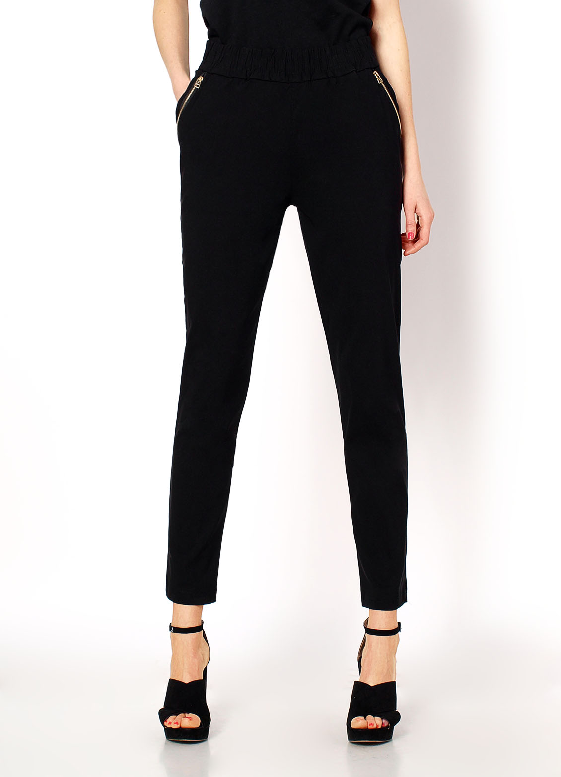 Spodnie ze zwężaną nogawką, w pasie na gumce. Elastyczny fason z kieszeniami. Materiał: 95% bawełna, 5% elastan. Modelka: wzrost 175 cm.