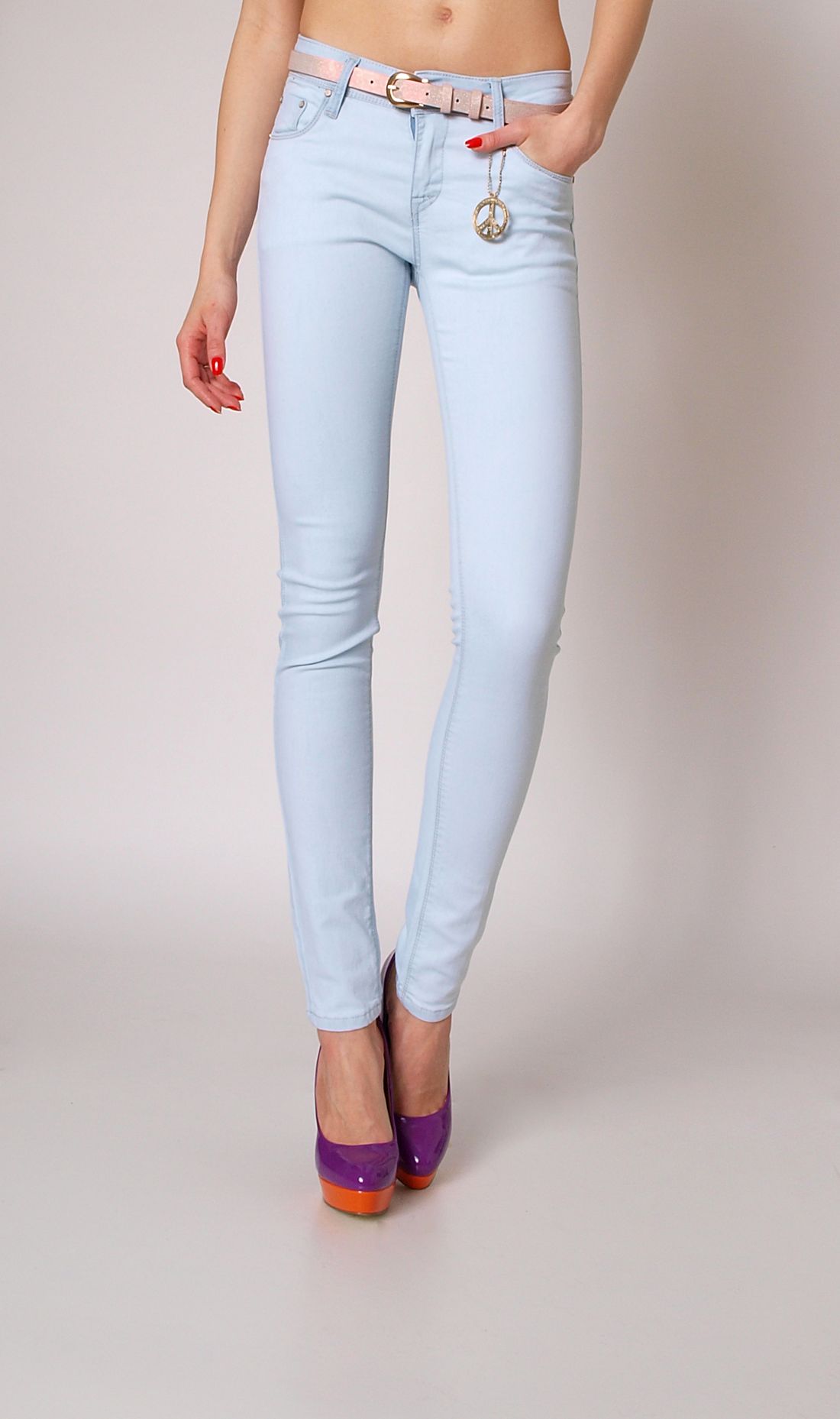 Klasyczne, jasne jeansy. Modne, gładkie rurki zapinane na zamek oraz guzik. Kieszenie z przodu i z tyłu, wykończone nitami. W pasie szlufki i zawieszka pacyfka zdobiona cyrkoniami. Dodatkowo w komplecie połyskujący pasek w dwóch wersjach kolorystycznych do wyboru. Na lewej tylnej kieszeni aplikacja z kolorowych cyrkonii z brytyjską flagą. Zawsze modny krój, świetnie prezentuje się na sylwetce. Jasny kolor jeansu, rewelacyjnie wysmukla nogi. Doskonałe na każdą okazję!Skład: 95% bawełna, 5% elastan