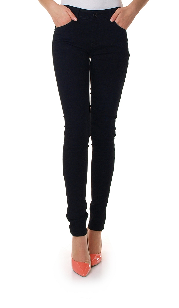 Wyszczuplające, seksowne czarne spodnie typu rurki. Kieszenie z tyłu zdobione błyszczącą nicią. Zapinane na zamek i guzik. Spodnie posiadają w pasie szlufki, dzięki czemu możliwa jest stylizacja z paskiem. Klasyczne, bawełniane jeansy. Zawsze modne i stylowe.Skład: 95% bawełna, 5% elastan