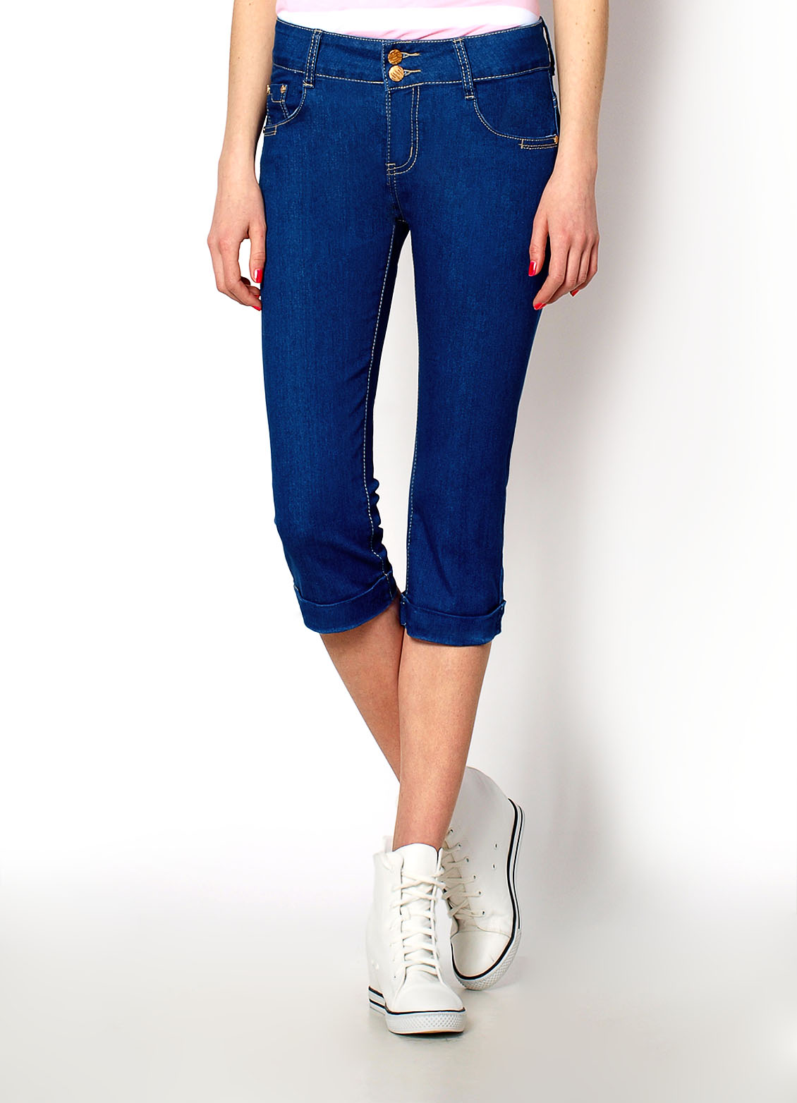 Klasyczne rybaczki jeans, zapinane na zamek i dwa guziki, w pasie szlufki,kieszenie z przodu i z tyłu, długość za kolano, nogawka zakończona zakładką, wykończenie kontrastową nicią. Materiał 95% bawełna, 5% lycraModelka wzrost 175cm, na co dzień nosi S/M