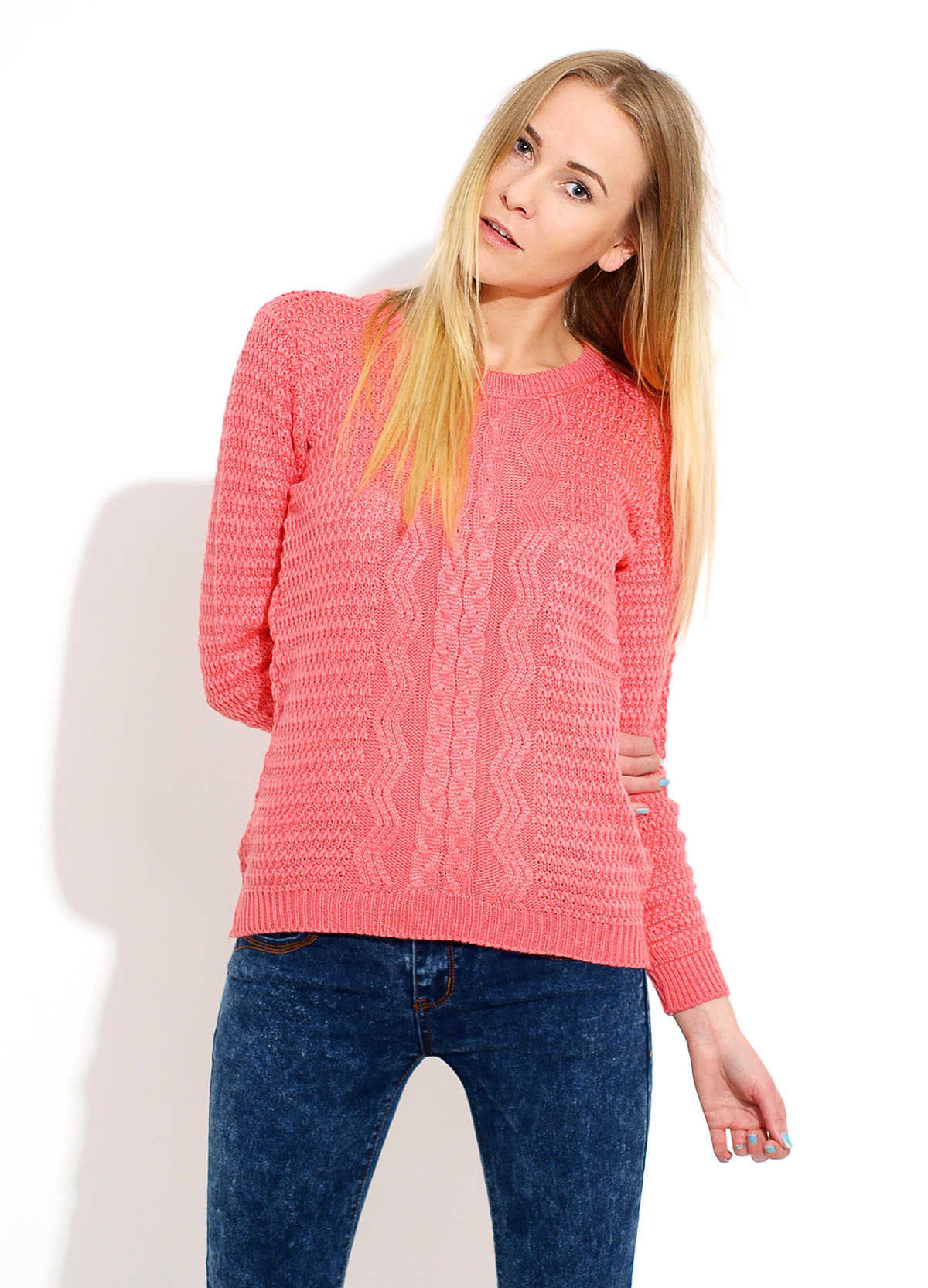 Sweter klasyczny fason, dekolt okrągły, dół i rękawy wykończone ściągaczami, z przodu zdobiony splotem warkocza. Materiał 30% wełna, 70% akryl (sztuczna wełna)Modelka wzrost 175cm, na co dzień nosi S/M, rozmiar z metki uniwersalny.