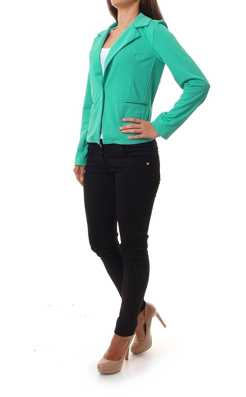 Klasyczny żakiet zapinany na stylowy guzik. Z przodu kieszenie. Na barkach w części wewnętrznej wszyte są poduszki. Wykonany z materiału przyjemnego w dotyku. Marynarka z wcięciem w talii co sprawia, że fajnie dopasowuje się do sylwetki. Skład: 65% bawełna, 30% poliester, 5% elastan