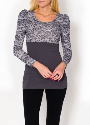 Kobieca bluzeczka z printem imitującym koronkę w kwiatowy wzór. Wykonana z doskonałej jakości wiskozy. Charakterystyczne marszczenia na rękawkach, ładnie podkreślają ramiona.Dekolt okrągły. Długie rękawy.Idealna na co dzień, jak i specjalne okazje. Świetnie się prezentuje. Podkreśla atuty sylwetki.Materiał 95% wiskoza, 5% lycra.Modelka wzrost 175cm, na co dzień nosi rozmiar S/M
