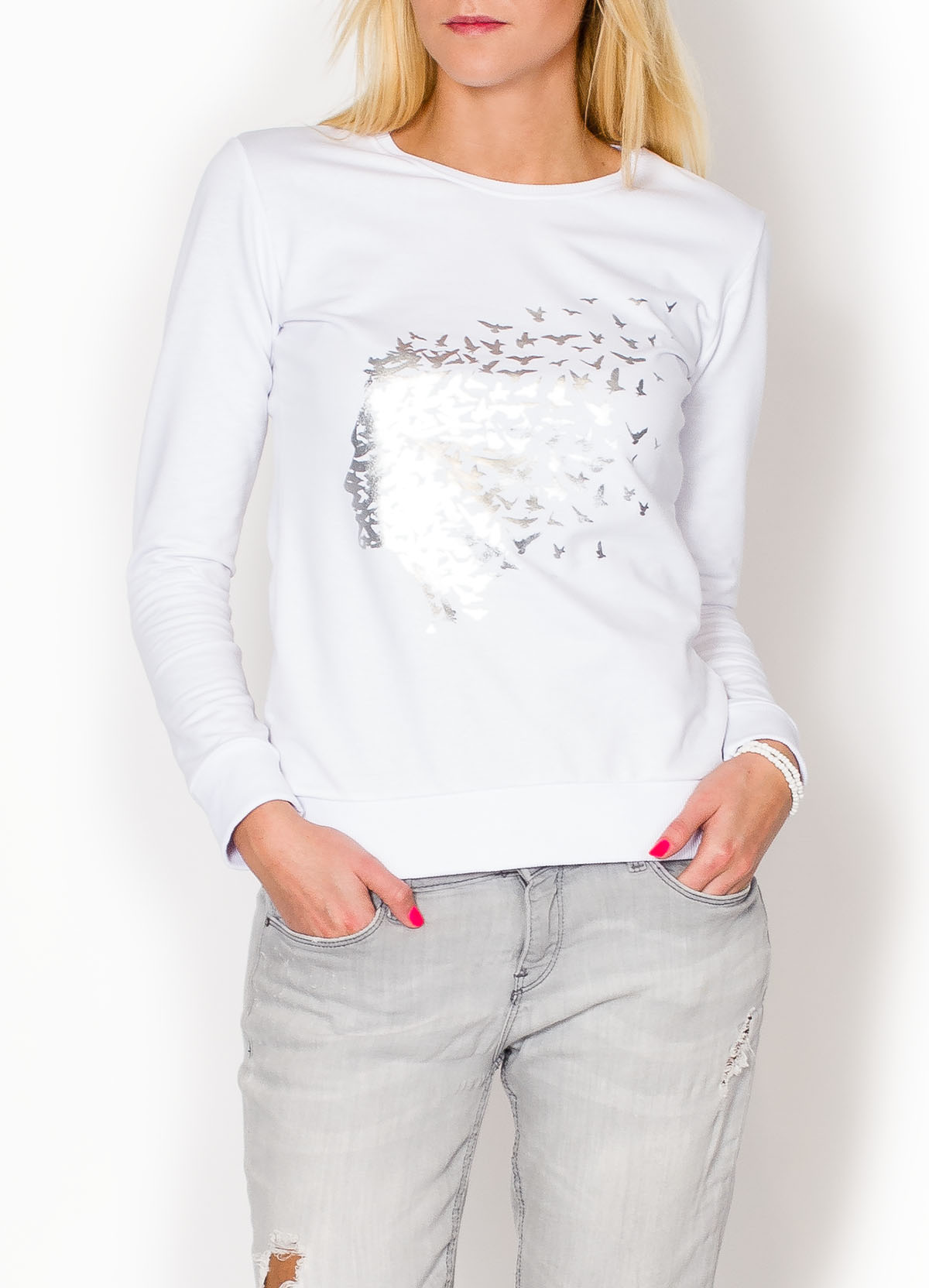 Praktyczna damska bluza z modnym błyszczącym detalem. Wkładana przez głowę, bez kaptura. Wykonana z dobrego gatunkowo materiału. Wygodna i komfortowa. Okrągły dekolt, rękawy i dół bluzy wykończone ściągaczem. Połyskujący nadruk - motyw ptaki.Błyszczące elementy w garderobie to jeden z ciekawszych trendów sezonu. Do wyboru kolory, które ożywią wiele codziennych outfitów. Produkt turecki świetnej jakości.Materiał 50% bawełna, 45% poliester, 5% elastan.Modelka wzrost 175cm, na co dzień nosi rozmiar S/M