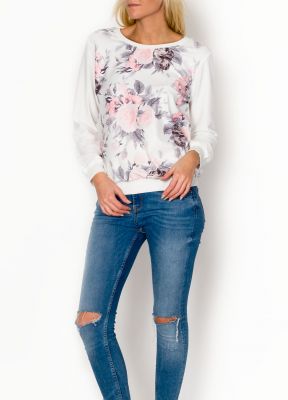 Kobieca bluza z kwiatowym wzorem z przody, dwu-kolorowa. Wykonana z miękkiego w dotyku, przyjemnego dla ciała materiału. Okrągły dekolt i długie rękawy. Dół oraz rękawy wykończone ściągaczem. Pastelowe kolory do wyboru. Bluzeczka ładnie prezentuje się na sylwetce. Kobiecy motyw w kwiaty subtelnie zdobi ubrania i dodaje wdzięku tworząc oryginalne i modne stylizacje. Pastelowe kolory pozwolą na dopasowanie do każdego stylu.Materiał 100% poliesterModelka wzrost 175cm, na co dzień nosi rozmiar S/M