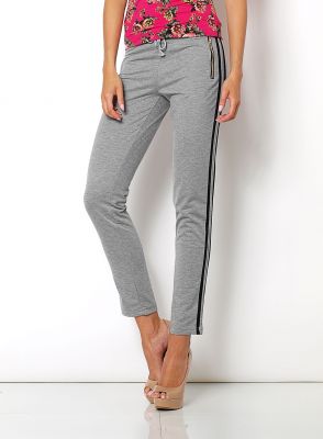 Wygodne rurki, spodnie dresowe ze wstawkami po bokach w postaci pasków, nieco zwężana nogawka, w pasie gumka i sznurek do regulacji. Z przodu złote zamki - imitacja kieszeni, z tyłu kieszenie bez zdobień. Materiał 65% bawełna, 35% poliester.Modelka wzrost 172cm, na co dzień nosi S/M, rozmiar z prezentacji produktu S/M