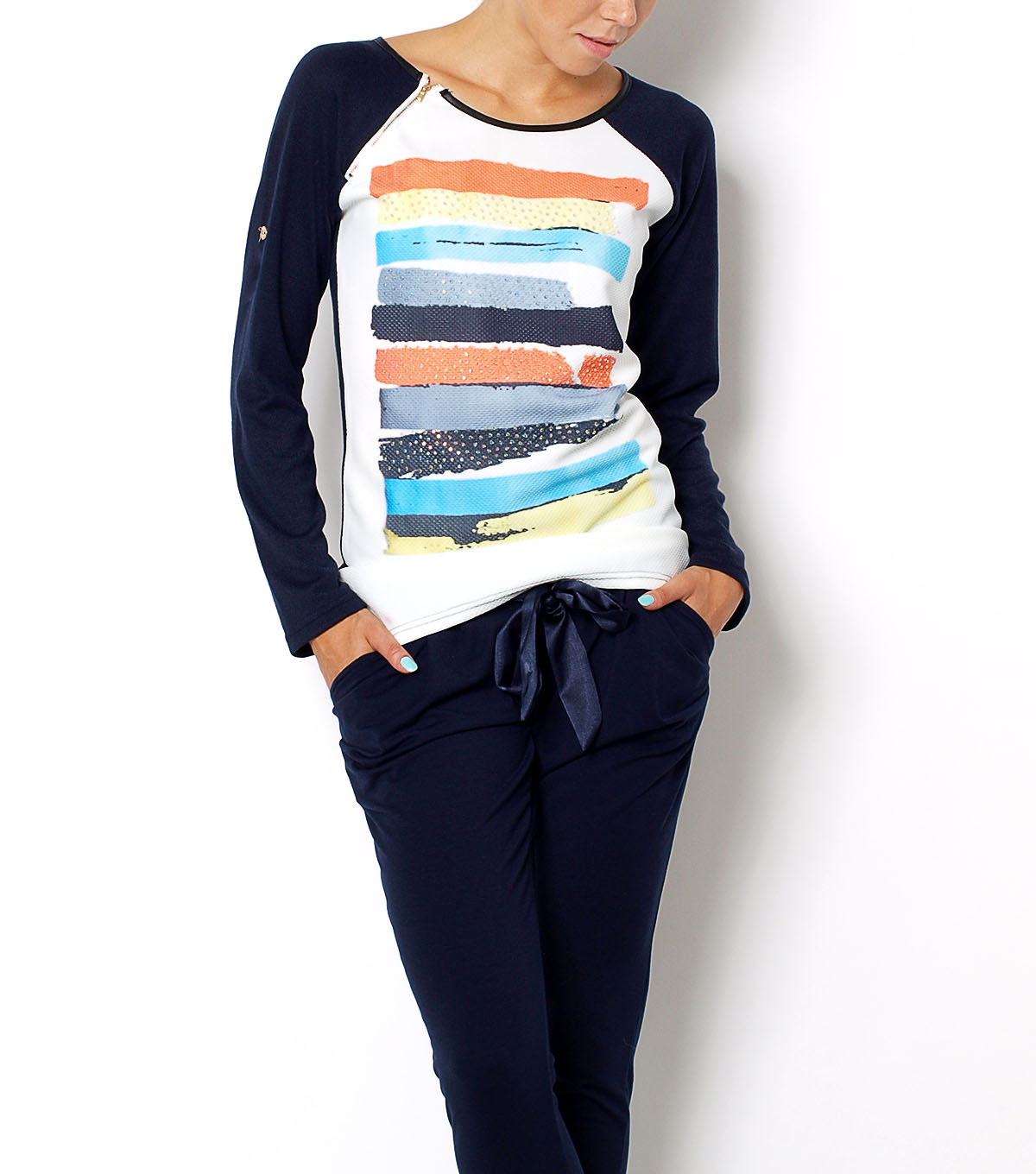 Kolorowy wzór, bluzka długi rękaw, możliwość podpięcia do 3/4 długości rękawa, nieco dłuższy tył, dekolt okrągły, z przodu złoty rozpinany zamek, grubszy materiał, delikatnie zdobiony dżetami.Materiał 65% bawełna, 35% poliester.Modelka wzrost 172cm, na co dzień nosi S/M, rozmiar z prezentacji produktu S/M
