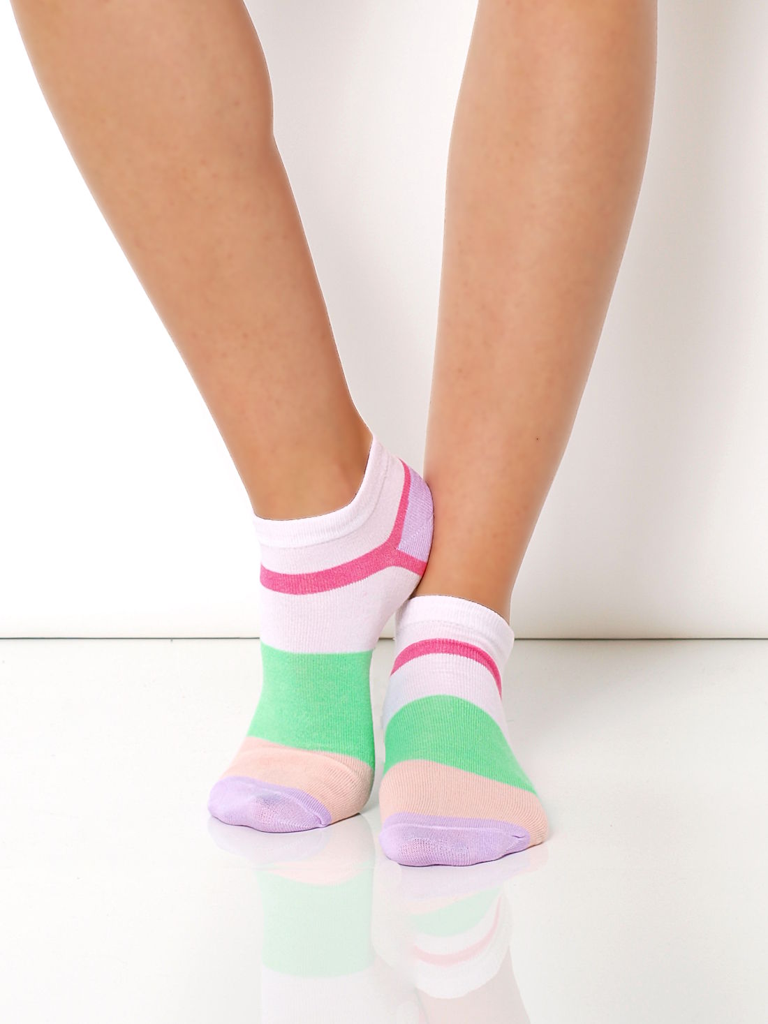 Wygodne bawełniane skarpety w paski. Komfortowe, kolorowe skarpetki stopki z elastycznym ściągaczem oraz wzmocnieniem na palcach i pięcie. Ładnie układają się na stopie, nie spadają z pięt. Bardzo praktyczne.Skład: 95% bawełna,5% elastan