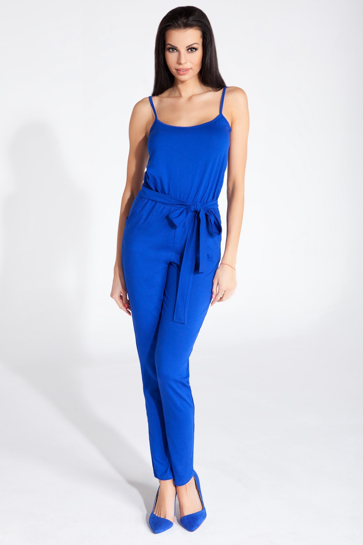 Prosty kombinezon letni na ramiączkach. W tali guma i szarfa do wiązania. Po bokach kieszenie wsuwane.