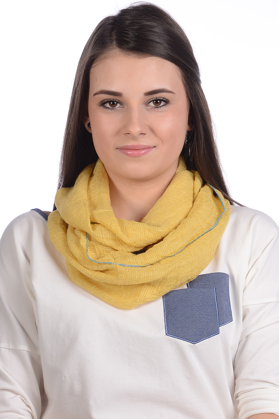 Jednolity wykończony lamówką w kontrastującym kolorze. Bardzo miły w dotyku, idealnie się układa i pasuje do wszystkiego. Można go nosić na kilka sposobów. Nie tylko ożywia strój , ale także znakomicie poprawia nastrój! Musisz go mieć!
