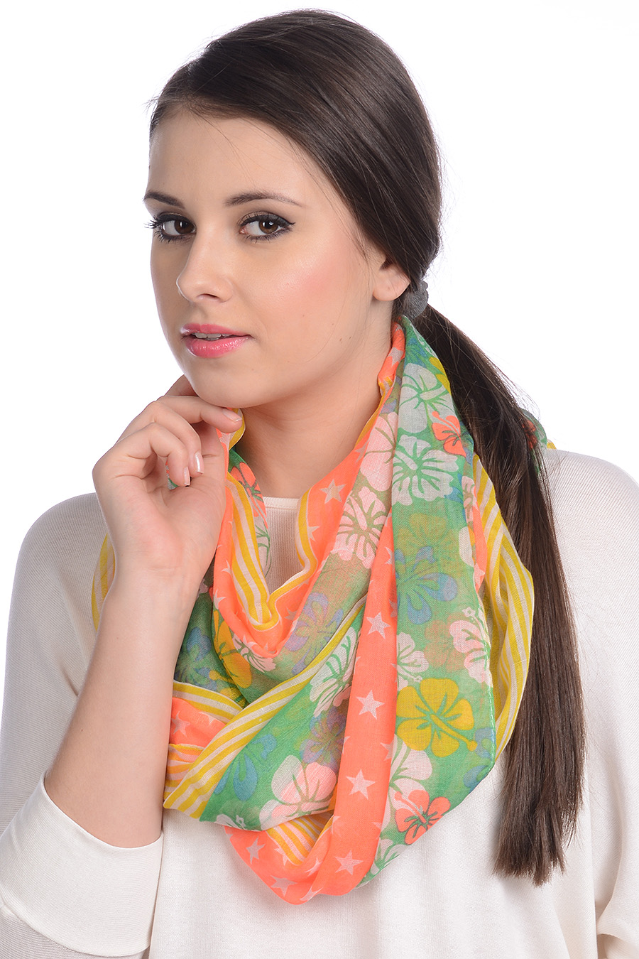 Komin wykonany z cienkiej tkaniny w bardzo modny wzór - kwiatów, paseczków i gwiazdek. Bardzo miły w dotyku, idealnie się układa i pasuje do wszystkiego. Można go nosić na kilka sposobów. Nie tylko ożywia strój , ale także znakomicie poprawia nastrój! Musisz go mieć!