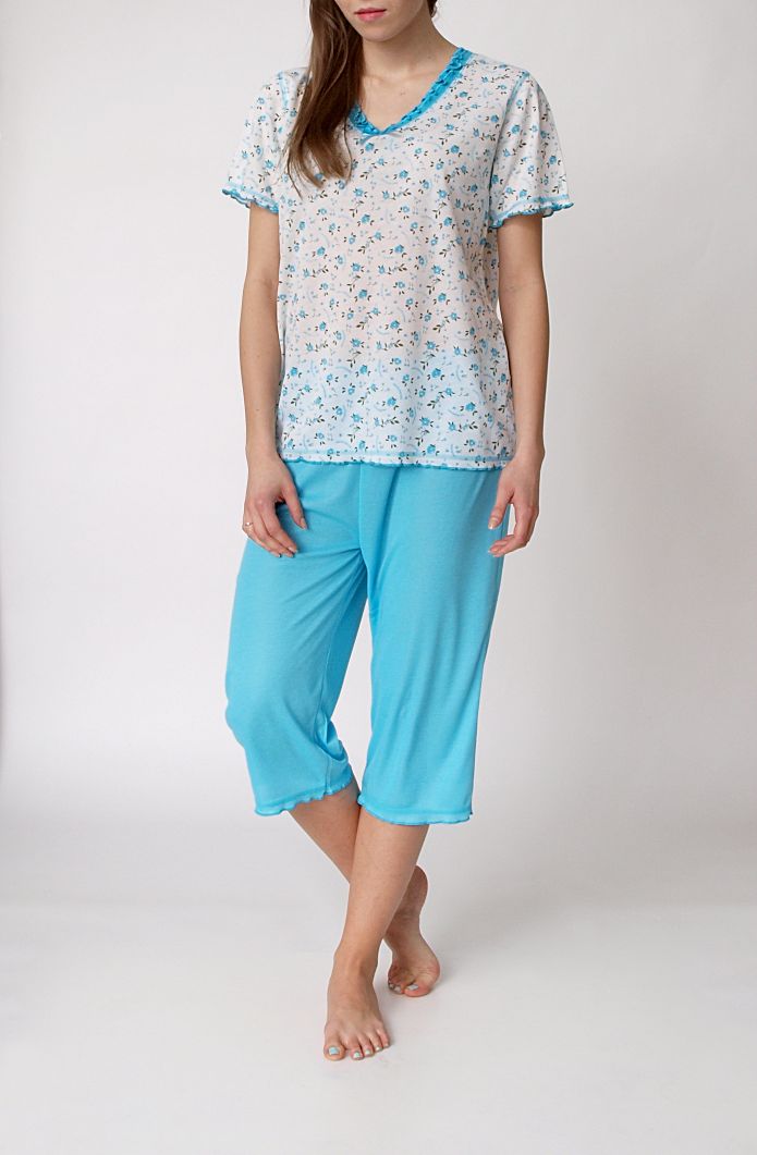 Wygodna piżamka w kwiatki. Bluzka z krótkim rękawkiem i spodnie typu rybaczki o długości 3/4. Spodenki w pasie na elastycznej gumce, z luźnymi nogawkami zakończonymi delikatną falbanką. Miękka i przyjemna w dotyku piżama. Skład: 65% bawełna, 35% poliester