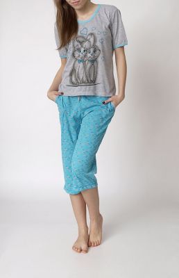Komfortowa, bawełniana piżamka. Wygodny komplet - rybaczki plus koszulka. Spodnie w serduszka, z nogawkami za kolano. Luźne spodenki z kieszeniami. W pasie elastyczna gumka, oraz sznureczek do regulacji. Szara koszulka z krótkim rękawem, wykończona lamówką w kolorze spodni. Z przodu uroczy nadruk z kotkami. Miły w dotyku materiał.Skład: 100% bawełna