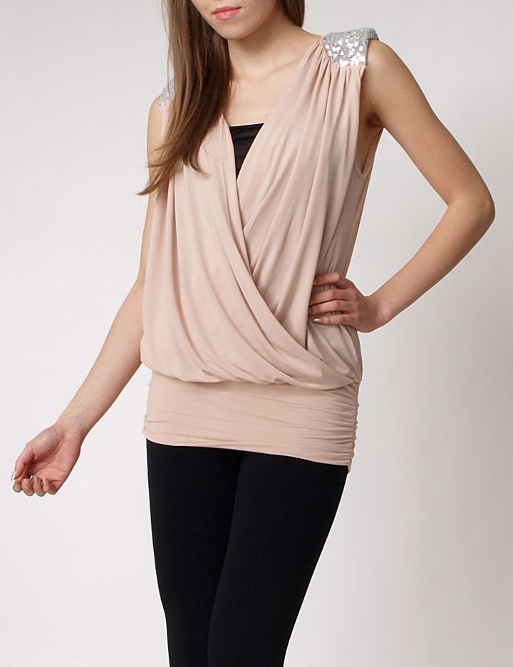 Imprezowa bluzka o fasonie bombki. Rewelacyjna kopertowa tunika z cekinowymi pagonami na ramionach (wewnątrz wszyte poduszki). Dół zakończony szerokim ściągaczem. Wykonana z przyjemnego, półmatowego materiału. Bardzo efektowna. Luźny, modny krój, ładnie podkreśli sylwetkę, bądź ukryje jej niedoskonałości.Skład: 35% bawełna, 65% poliester.