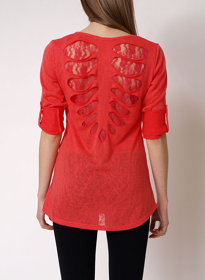 Miła w dotyku, bawełniana bluzka z długim rękawem. Istnieje możliwość podwinięcia rękawków do długości 3/4. Koszulka z ozdobnymi plecami. Delikatna koronka, oraz surowo wykończone rozcięcia, nadają całości niebanalnego charakteru. Przód i rękawy gładkie. Dekolt okrągły. Dostępna w modnych pastelowych odcieniach.Skład: 65% bawełna, 35% poliester.