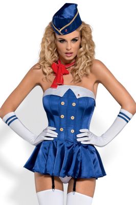 Seksowny, 6-częściowy kostium - wszyscy na pokład. Gorset z uroczą baskinką, soczysty, chabrowy kolor, u góry biały kołnierzyk z delikatną przypinką. Z przodu kremowe guziczki, liczne fiszbiny modelujące sylwetki, z boku zameczek. Z tyłu gorsetowe wiązanie umożliwiające perfekcyjne dopasowanie. Gorset połączony z regulowanymi pasami do pończoch. W komplecie seksowne stringi, białe, kryjące rajstopy, białe rękawiczki oraz czapka stewardessy. Dopełnieniem stroju jest soczysta, czerwona apaszka.