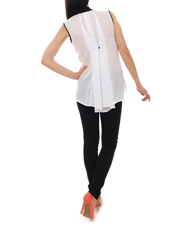Nietuzinkowa bluzka / koszula z kontrastowym kołnierzykiem. Zapinana na guziczki. Tył dłuższy misternie zdobiony. Top wykonany z oddychającego materiału.Skład: 65% bawełna, 35% poliester