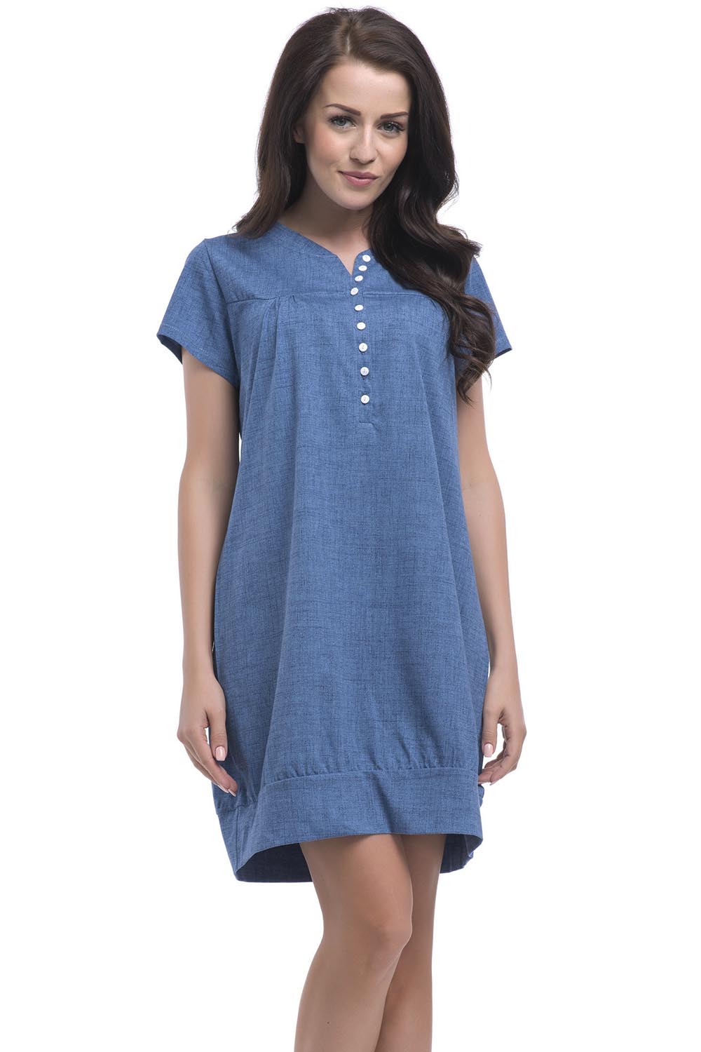 Niezwykle komfortowa i przy tym urocza koszula nocna. Rękaw krótki. Dekolt okrągły z rozcięciem. Z przodu zapięcie na guziki. Dół wykończony ściągaczem. Idealna propozycja na jesienne i zimowe noce. Koszula wykonana jest z wysokiej jakości, przyjemnej w dotyku bawełnianej dzianiny imitującej jeans.