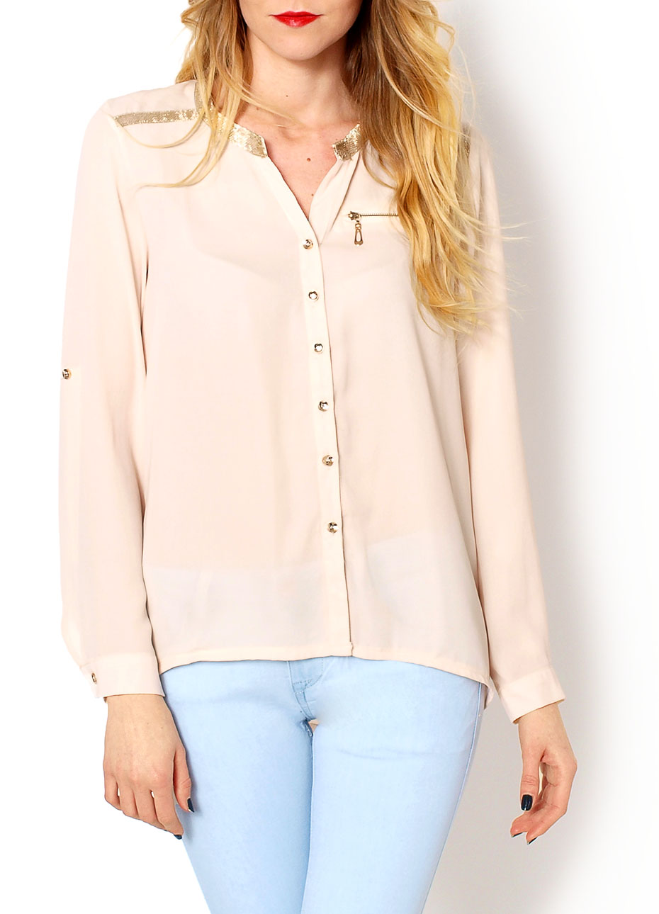 Koszula szyfonowa, zapinana na guziki, półprzezroczysta, okrągły dekolt, dekolt i ramione ze złota lamówką, na piersi zamek z imitacją kieszeni, długi rękaw z możliwością podpięcia, rękaw z mankietem, tył lekko dłuższy. Materiał 100% poliester.Modelka wzrost 175cm, na co dzień nosi S/M, rozmiar z prezentacji produktu S