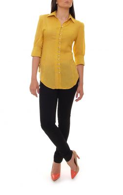 Zapinana z przodu na brylantowe guziczki, elegancka dłuższa KOSZULA z kołnierzykiem. Rękawy 3/4 i tył bluzki wiązane a'la gorset. Delikatnie dłuższy tył. Wykonana z delikatnego materiału.Skład: 65% bawełna, 35% poliester