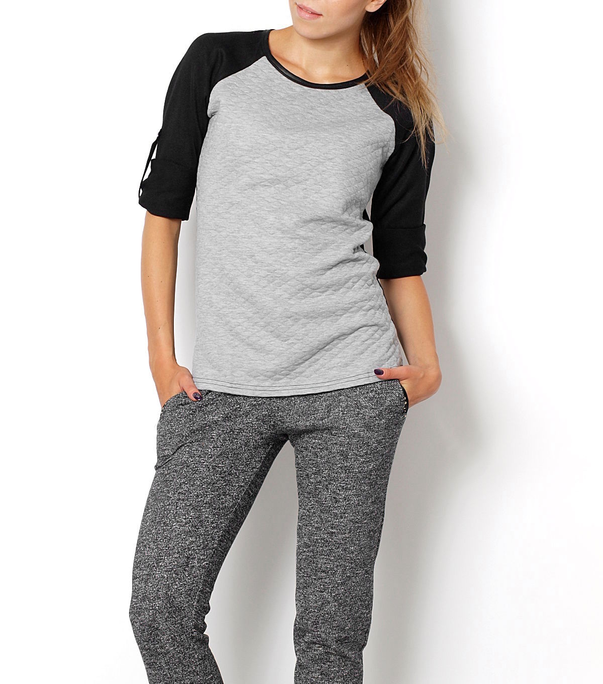 Modna pikowana koszulka z długimi rękawami. Dwukolorowa bluzka z okrągłym dekoltem wykończonym lamówką a`la skóra. Możliwe jest podpięcie rękawów do długości 3/4. Materiał przyjemny w dotyku. Bardzo praktyczna propozycja, która urozmaici wiele codziennych stylizacji.Skład: 65% bawełna, 35% poliester.Wzrost modelki: 172cmModelka ma na sobie: rozmiar z metki S/MNa co dzień nosi rozmiar: S