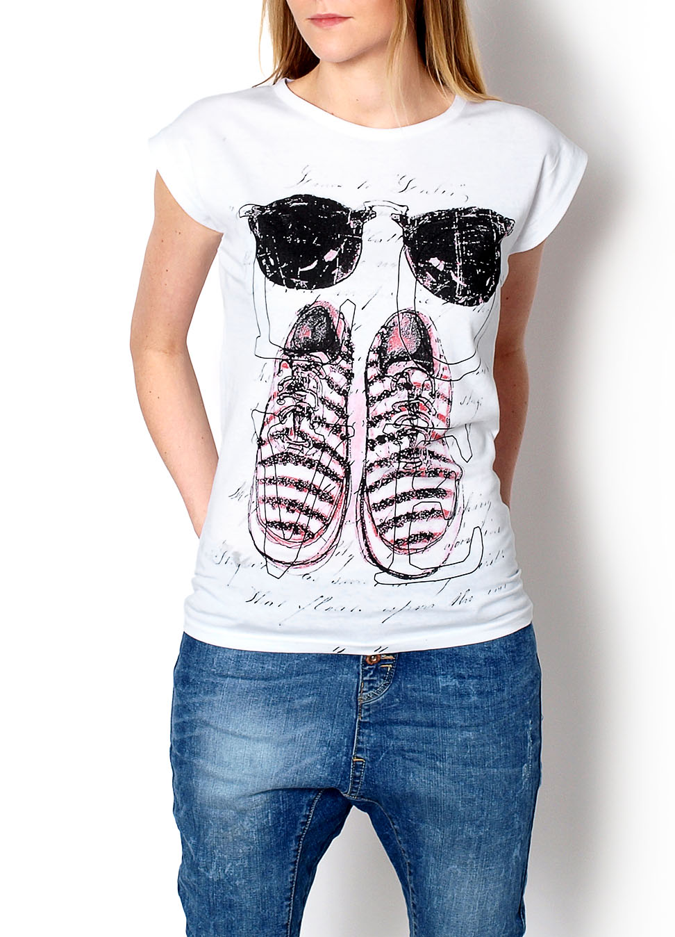 Bluzka posiada okrągły dekolt. Oryginalny nadruk z przodu. Wykonana z lekkiej, oddychającej bawełny. Idealna do jeansów, letnich szortów czy spódniczki. Materiał 100% bawełnaModelka wzrost 175cm, na co dzień nosi S/M, rozmiar z prezentacji produktu S