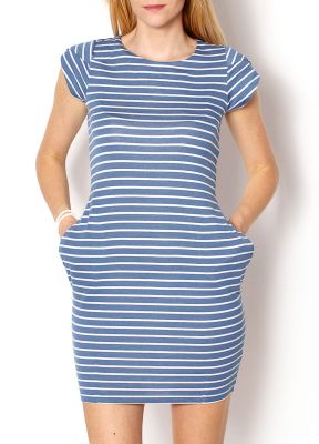 Sukienka z krótkim rękawem typu bombka w cienkie poziome paski, z tyłu od góry złoty zamek, dekolt okrągły.Materiał 92% TC (bawełna+poliester), 8% spandex.Modelka wzrost 175cm, na co dzień nosi S/M, rozmiar z prezentacji produktu M.