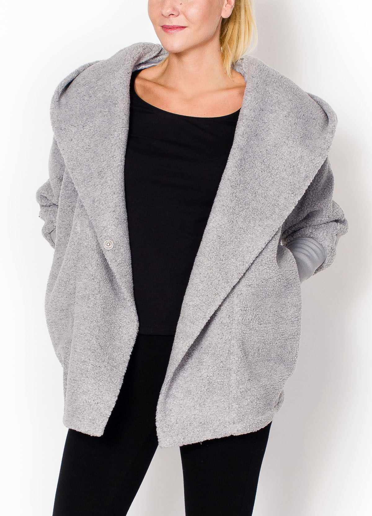 Gruba, ciepła kurtka damska - idealna na jesienną porę, modny fason. Zapinana na zatrzask. Oversizowy model z obszernym kapturem. Dekolt w serek, z szerokim kołnierzem. Rękawy z długim elastycznym ściągaczem. Po bokach wsuwane kieszenie. Wewnątrz na podszewce. Do wyboru klasyczne kolory.Komfortowa i wygodna kurteczka typu miś. Otula sylwetkę i świetnie ochroni przed pierwszymi chłodami. Kurtka z futerkiem jest przytulna i bardzo przyjemna w użytkowaniu. Efektowny minimalizm w dekolcie i detalach dodaje stylu. Modelka wzrost 175cm, na co dzień nosi rozmiar S/M
