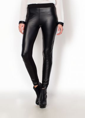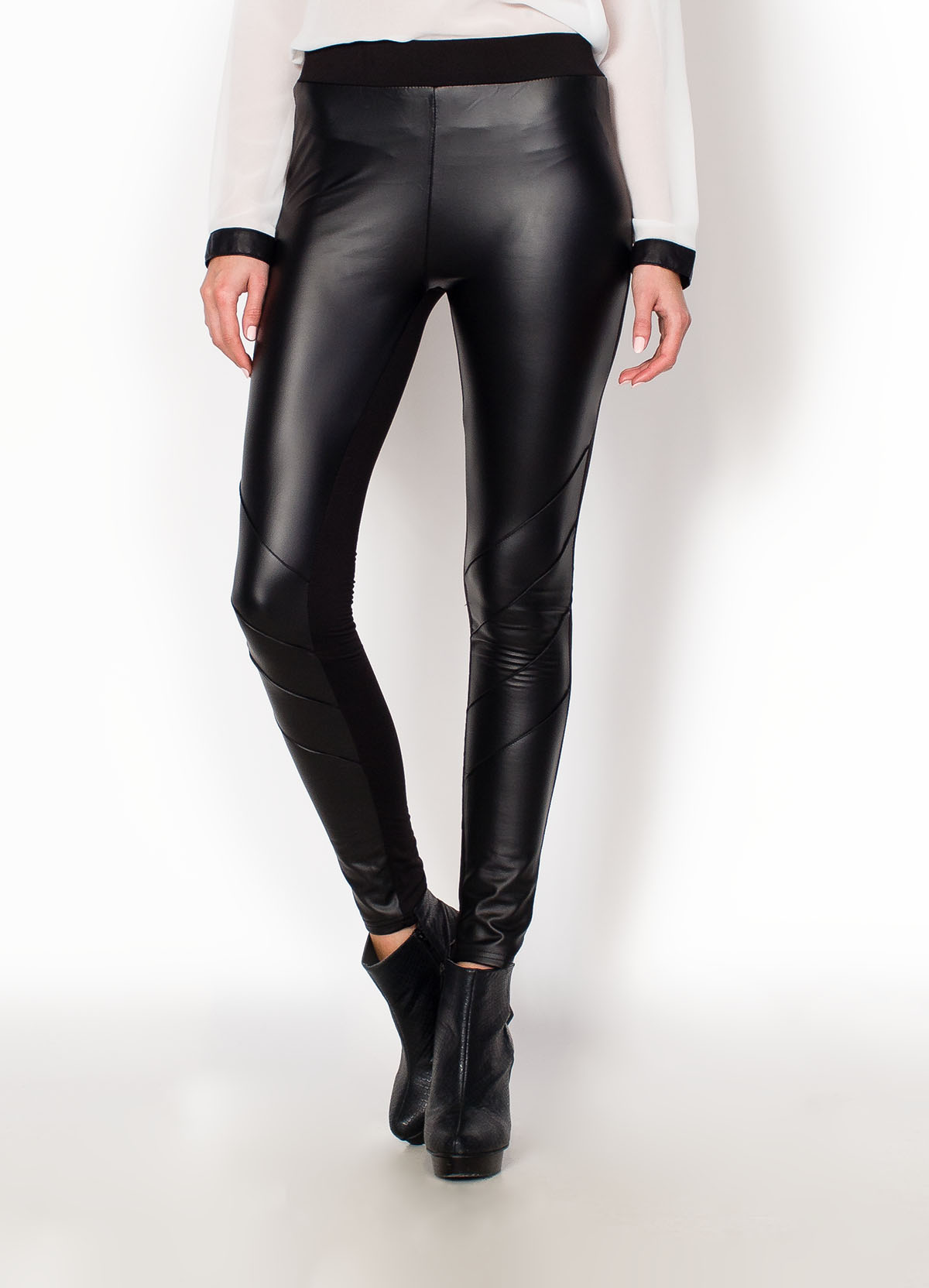 Legginsy - rurki a`la skóra z łączonych materiałów. W pasie na elastycznej gumce. Przód imitujący skórę, tył z gładkiego, matowego materiału. Na wysokości kolan modne przeszycia. Wygodne, dobrze dopasowują się do ciała. Legginsy to element garderoby, który podkreśla atuty kobiecej sylwetki. Legginsy i spodnie skórzane to również gorący hit w modzie damskiej. Idealna propozycja dla pań lubiących odważne, jak i klasyczne rozwiązania. Ładnie komponują się z botkami jak i obuwiem sportowym.Modelka wzrost 175cm, na co dzień nosi rozmiar S/M