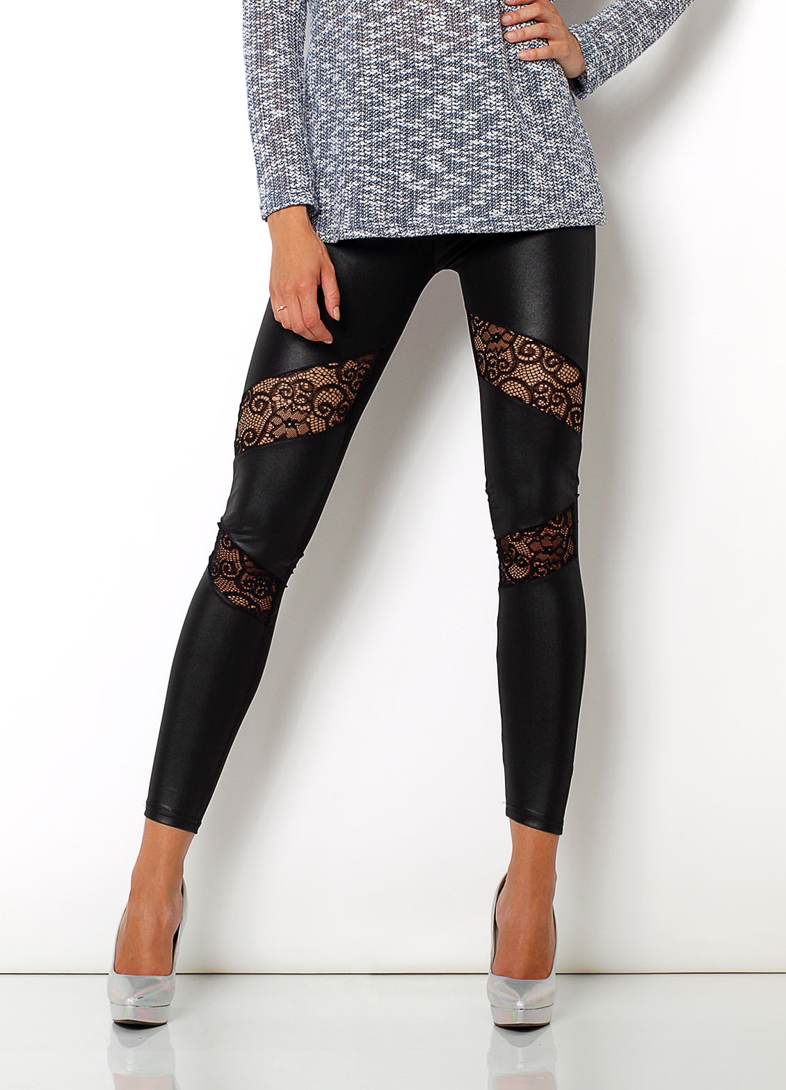 Czarne legginsy, na udzie i pod kolanem wstawki z koronki, w pasie gumka, z przodu materiał śliski, z tyłu matowy i gładki. Materiał 10% bawełna, 85% poliester, 5% elastan. Modelka wzrost 172cm, na co dzień nosi S/M, rozmiar z prezentacji produktu M/L