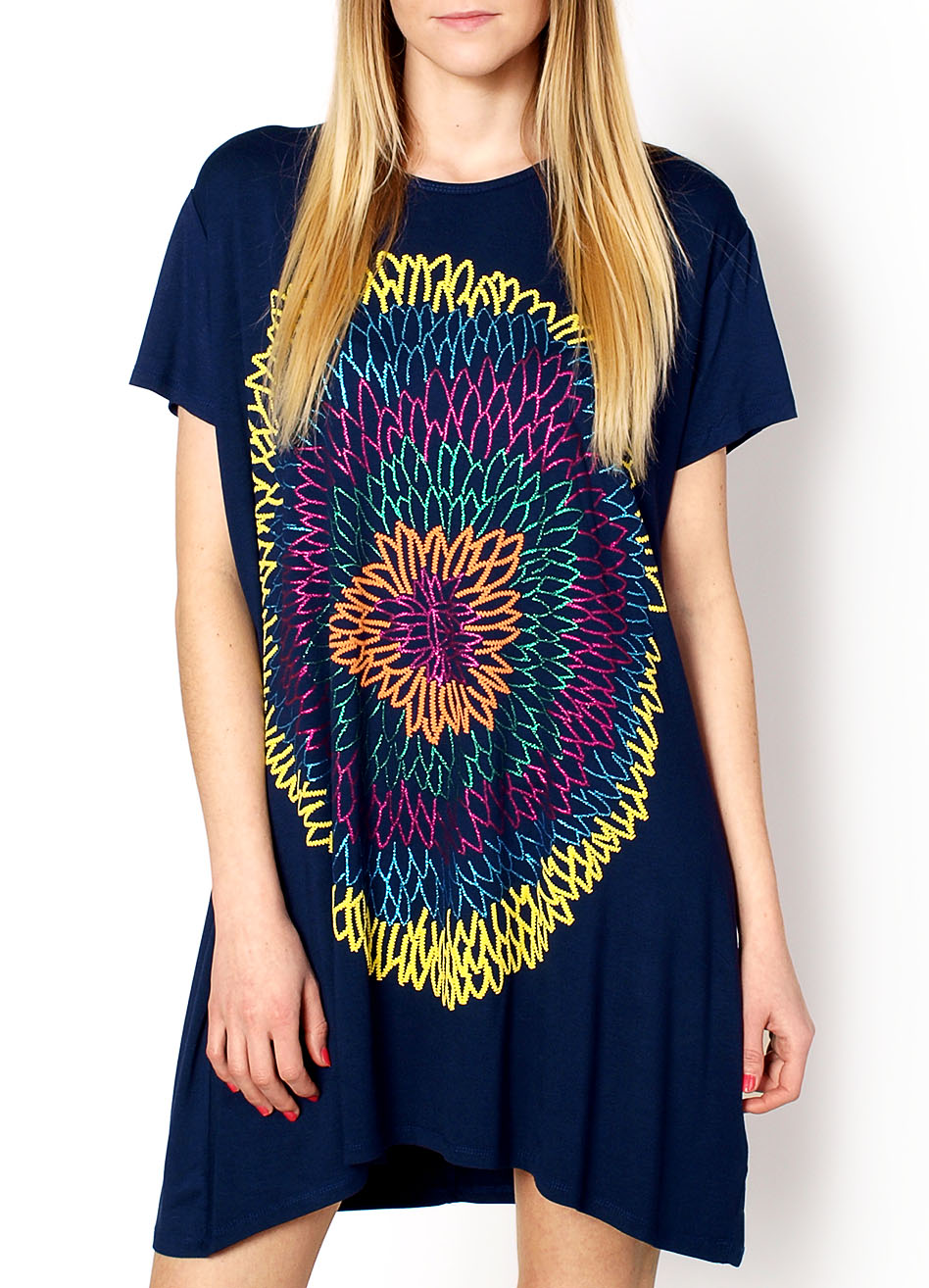 Tunika z oryginalnym printem. Fason asymetryczny, boki dłuższe. Dekolt okrągły, rękawy krótkie. Materiał: 95% wiskoza, 5% elestan.Modelka: wzrost 175 cm, na co dzień nosi S/M.