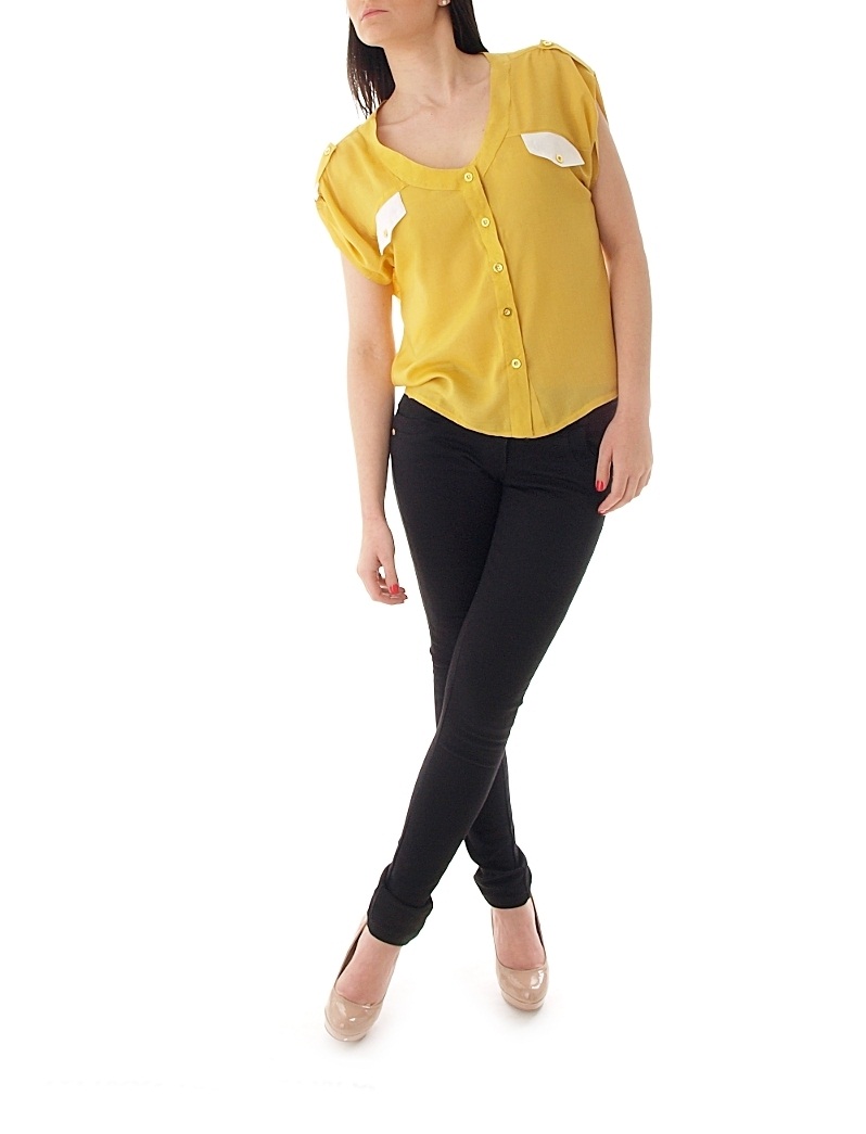 Bluzka z krótkim, delikatnie podwijanym rękawem.Koszulka zapinana na złote guziki. Fajny materiał i wykonanie. Skład: 65% bawełna, 35% poliester
