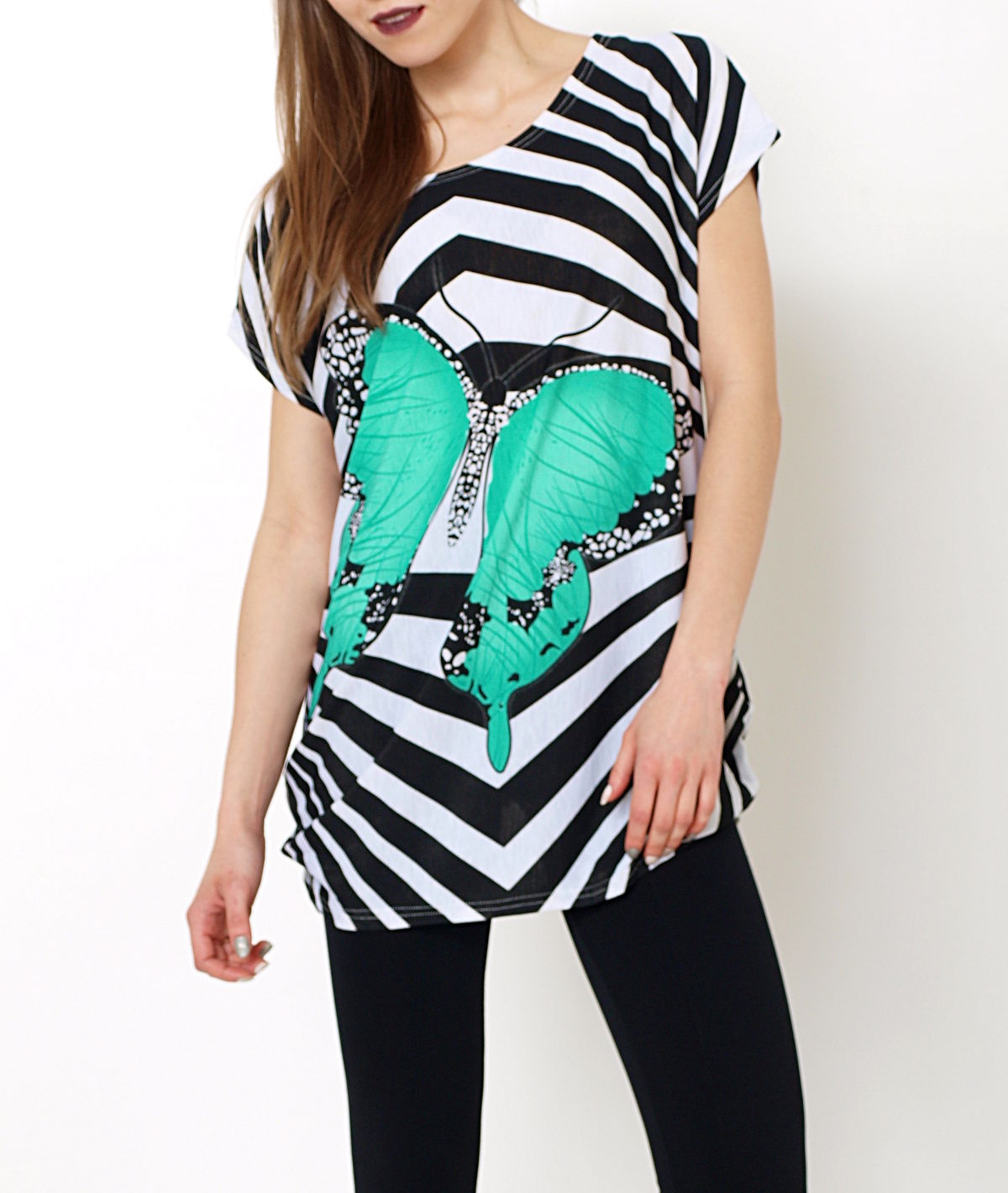 Oryginalna tunika w czarno - białe paski, z przepięknym motylem w kontrastowym kolorze. Niesamowita długa bluzka, idealna do gładkich legginsów. Wykonana z elastycznego materiału o ciekawej fakturze. Rękawki krótkie, dekolt okrągły. U dołu, po bokach, delikatne drapowania. Modna, a zarazem bardzo stylowa, pasuje do wielu eleganckich stylizacji, jak również tych mniej formalnych. Luźny krój, ładnie układa się na sylwetce. Rewelacyjna propozycja na dla pań o każdym typie figury.Skład: 65% bawełna, 35% poliester.