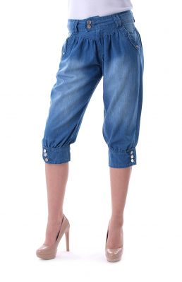 Luźne spodnie 3/4 zakończone efektownymi mankietami ze srebrnymi butonami. Krótkie spodenki / rybaczki wykonane z miękkiej jeansowej tkaniny. Z przodu kieszenie. Ztyłu imitacja kieszeni.Delikatnie wycierane. Super komfortowe i stylowe! Skład: 100% BAWEŁNA