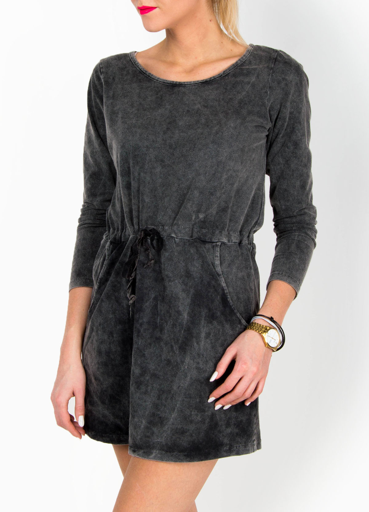 Marmurkowa sukienka, długi rękaw, po bokach kieszenie, ściągana w talii troczkiem, dekolt okrągły, na plecach zamek. Odcień oraz wzór dekatyzacji może nieznacznie różnić się od prezentowanego na zdjęciu.Materiał 90% bawełna, 10% elastan.Modelka wzrost 175cm, na co dzień nosi S/M, rozmiar z prezentacji produktu uniwersalny.