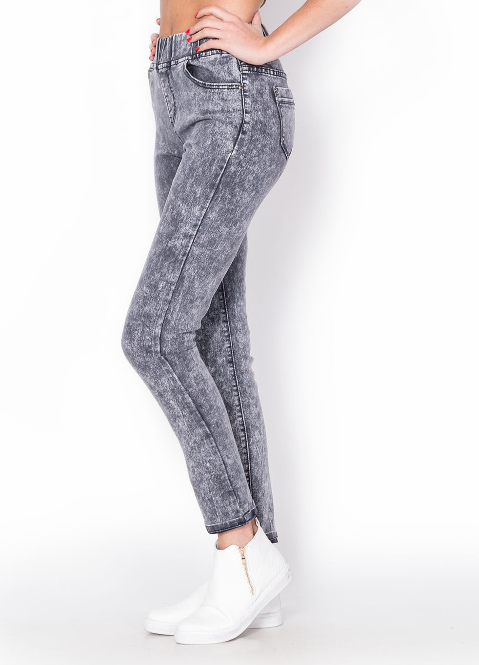 Kobiece marmurkowe spodnie na gumce. Modne rurki, wykonane z gumowanego jeansu, który dobrze dopasowuje się do ciała. Wyższy stan z szerokim, elastycznym pasem, który wysmukli biodra i brzuch. Z przodu i z tyłu kieszenie. Marmurkowe ubrania to ciekawy trend w modzie damskiej. Spodnie będą dobrym uzupełnieniem wielu stylizacji, zarówno do sportowego, jak i eleganckiego stylu. Idealne na jesienno - zimową porę.Materiał 95% bawełna, 5% lycra. Modelka wzrost 175cm, na co dzień nosi rozmiar S/M