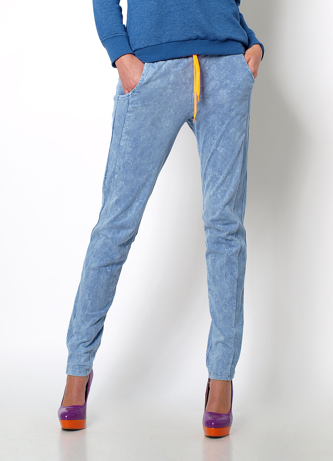 Dresowe rurki, dekatyzowane. W pasie na gumce wraz ze sznurkiem do regulacji. Tył gładki, na przodzie kieszenie. Wzdłuż nogawek oryginalne wstawki.Modelka: wzrost 175 cm, na co dzień nosi S/M, rozmiar z prezentacji produktu M.