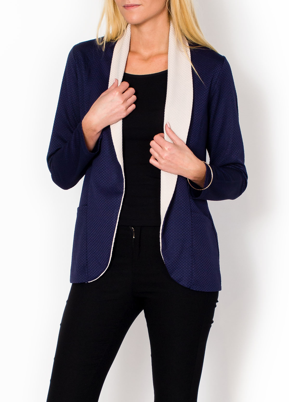 Pikowany żakiet damski / marynarka z kołnierzem w kontrastowym kolorze. Wykonany z dobrej jakości materiału o pikowanej fakturze. Dobrze skrojony i wykończony. Z przodu kieszenie. Wywijany kołnierz jest bardzo efektowny, nadaje całości elegancji i optycznie wydłuża sylwetkę. Klasyczne kolory do wyboru.Wspaniała propozycja, by wyglądać modnie i stylowo. Marynarka świetnie się prezentuje w różnych zestawieniach i dodaje wyjątkowej kobiecości każdej stylizacji. Noszona z jeansami i zawiniętymi rękawami doda świeżości i miejskiego stylu oficjalnym strojom, a zestawiona z eleganckim spodniami czy spódnicą podkreśli klasyczny wygląd.Materiał 35% poliester, 65% bawełnaModelka wzrost 175cm, na co dzień nosi rozmiar S/M