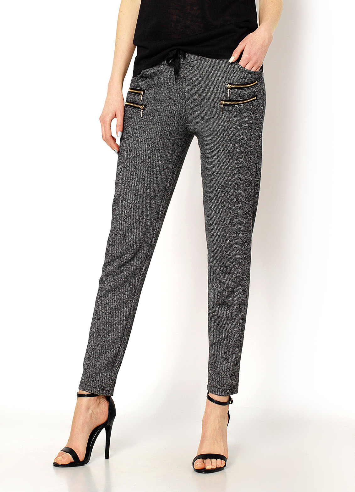 Spodnie z lekko zwężaną nogawką, w pasie na gumce. Dodatkowo sznurek do regulacji. Na przodzie kieszenie oraz ozdobne suwaki na biodrach.Materiał: 65% bawełna, 30% poliester, 5% elastan.Modelka: wzrost 175 cm, na co dzień nosi S/M, rozmiar z prezentacji produktu M.