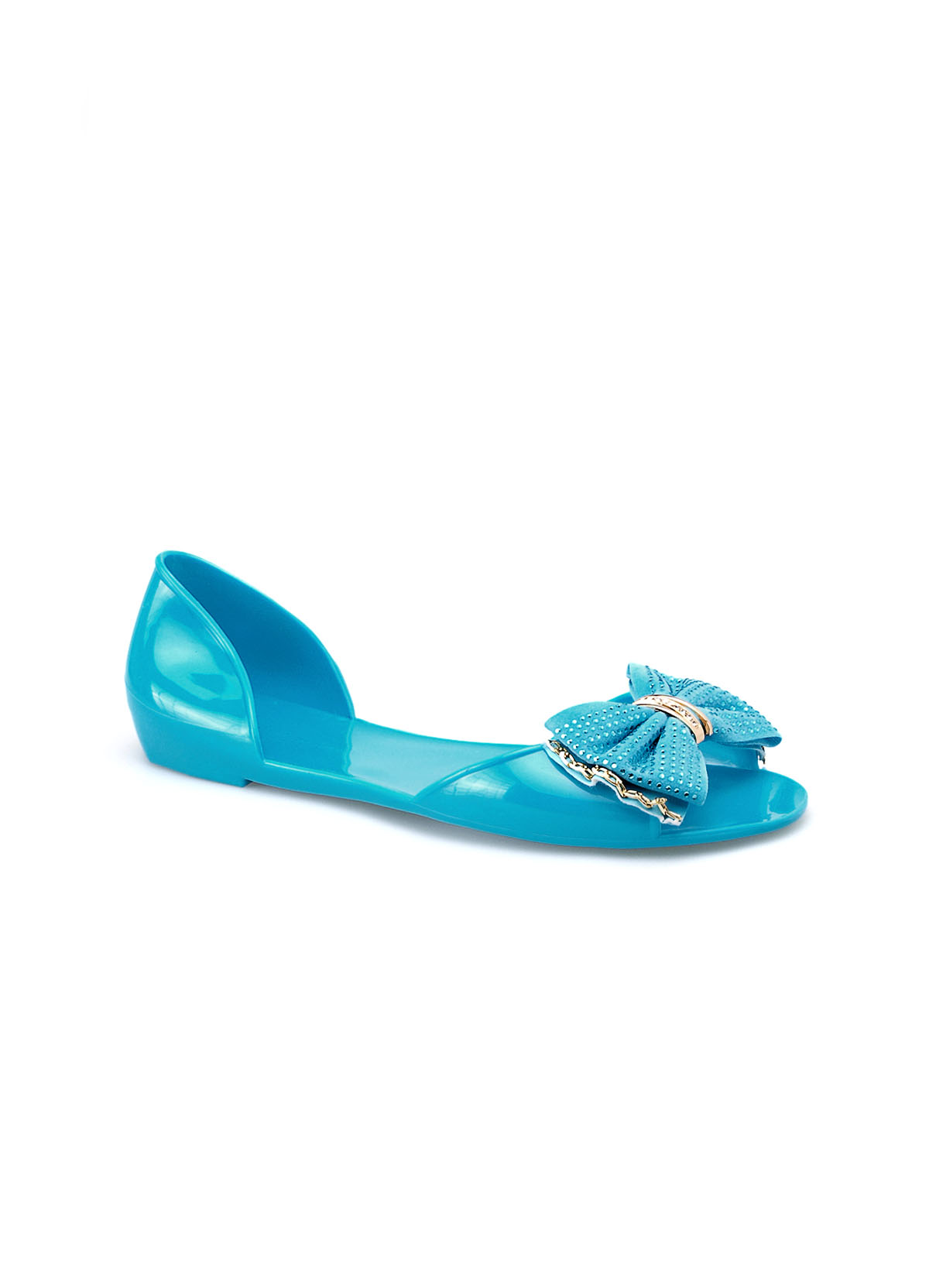 Baleriny w całości wykonane z gumy, płaska podeszwa, zdobione z przodu kokardą z połyskującymi elementami.