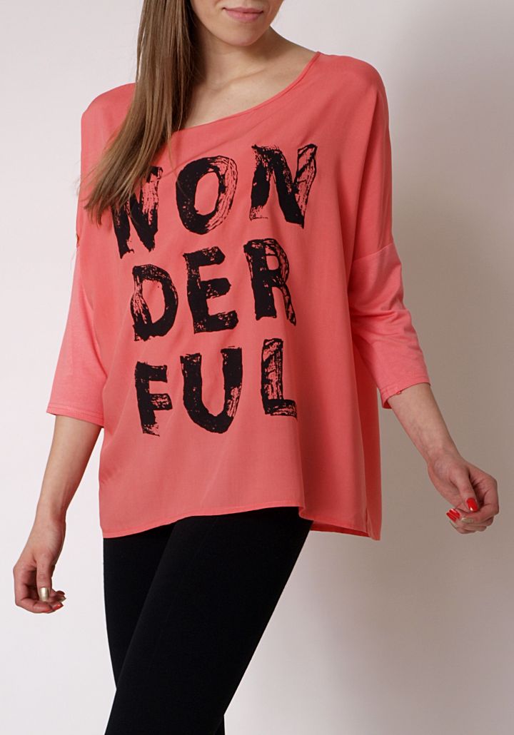 Bluzka o modnym, szerokim kroju. Wykonana z kryjącego szyfonu tunika z nadrukiem z przodu. Rękaw o długości 3/4 z możliwością podwinięcia. Niezwykle wygodna i komfortowa. Świetnie prezentuje się na sylwetce. Idealna do wielu codziennych stylizacji. Dostępna w najmodniejszych kolorach tej wiosny. Skład: 100% bawełna