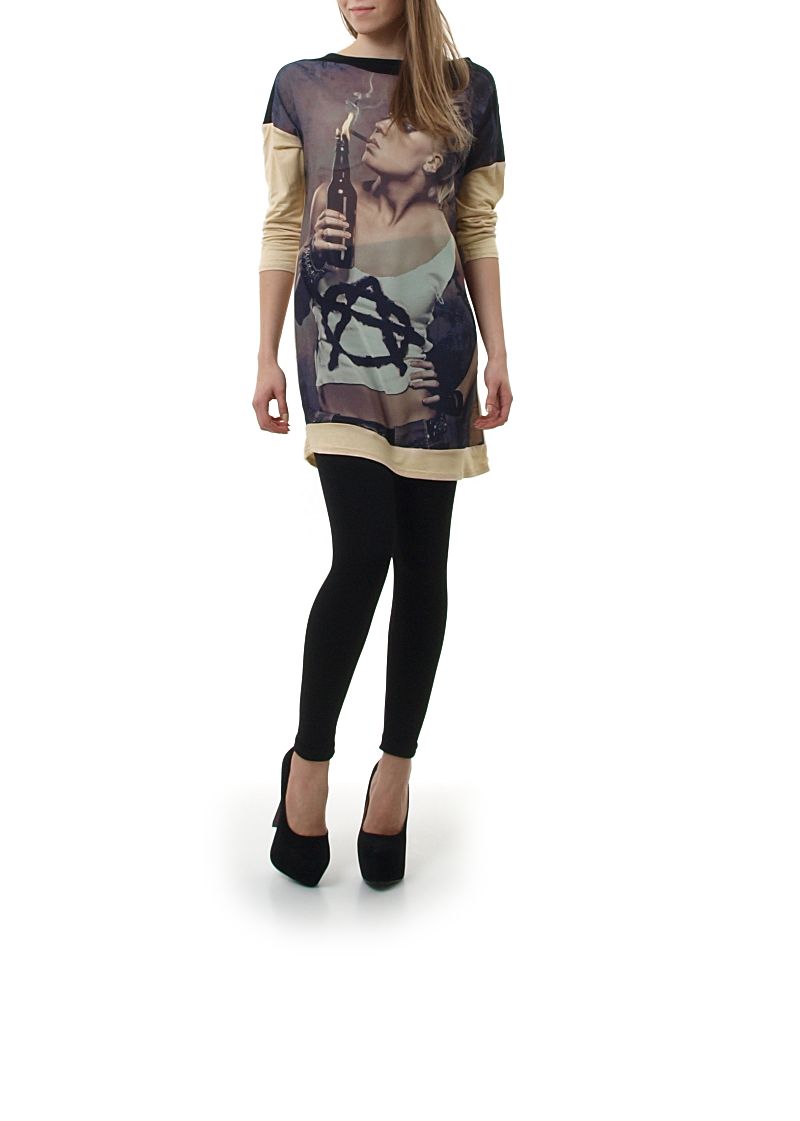 Wyjątkowa tunika z motywem kobiety z przodu. Piękna, szeroka bluzka typu nietoperz, z rękawem 3/4. Przód półprzezroczysty, szyfonowy. Tył oraz rękawy gładkie, wykonane z miękkiego, wyjątkowo przyjemnego materiału. Możliwość podwinięcia rękawków. Dekolt łódka. Luźny, modny fason, oraz ciekawy nadruk, sprawiają, że tunika prezentuje się bardzo oryginalnie i nowocześnie. Pasuje do każdego typu figury.Skład: 100% poliester / 95% rayon, 5% spandex.