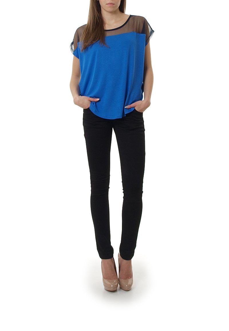 Bardzo kobieca bluzka wykonana z przyjemnego w dotyku, elastycznego materiału. Góra z prześwitującej siateczki, która seksownie eksponuje ramiona. Bluzka o luźnym kroju, bez rękawów. Okrągły dekolt. Świetnie prezentuje się na sylwetce. Niezwykle modny model w tym sezonie.