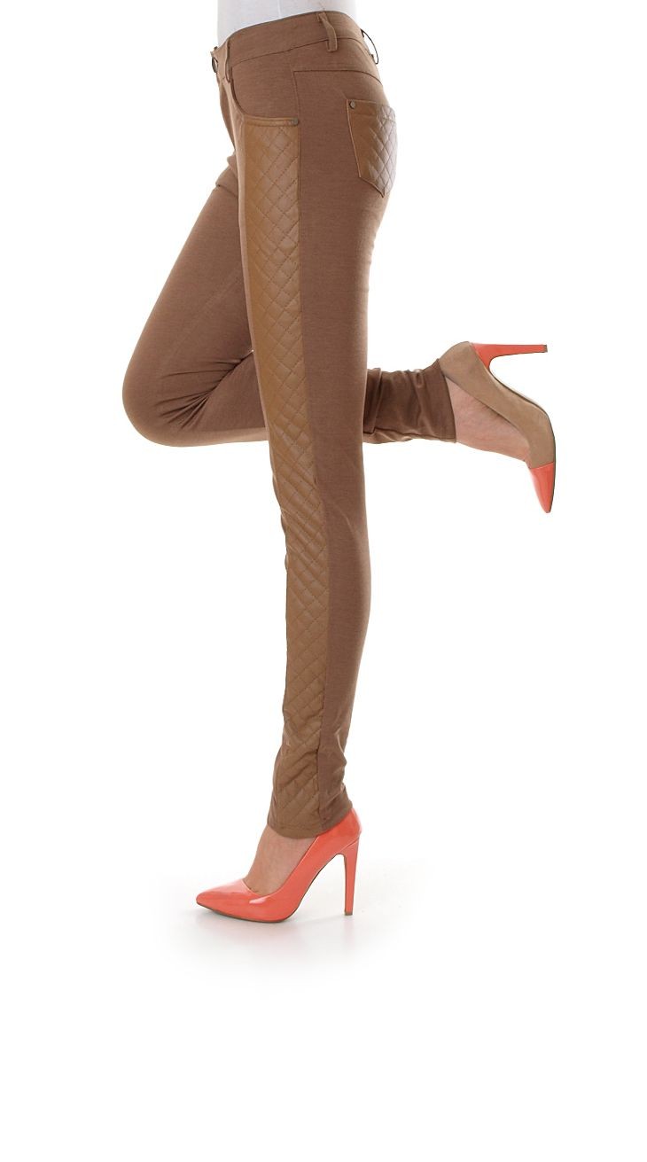 Bawełniane spodnie z modnymi, pikowanymi wstawkami z ekoskóry. Zapinane na zamek oraz guzik. Kieszenie z przodu i z tyłu. Spodnie ze zwężanymi nogawkami. Bardzo stylowe rurki, świetnie prezentują się na sylwetce.Skład: 65% bawełna, 35% poliester.