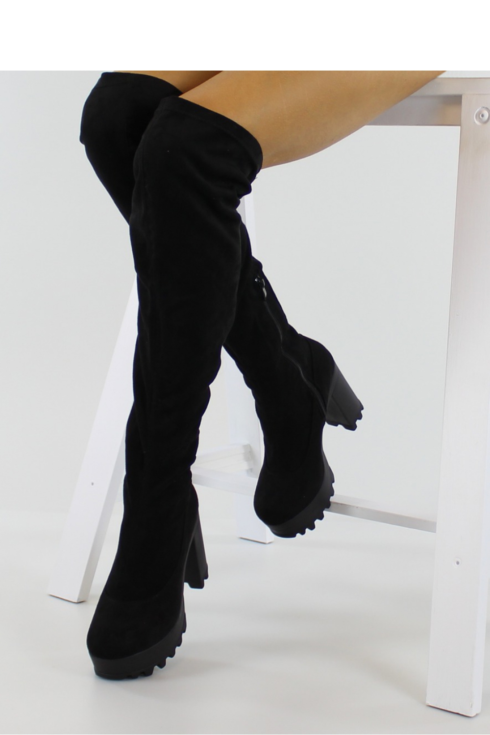 Wyjątkowo stylowe muszkieterki block heels z cholewką powyżej kolana. Mają wysoki ale szeroki obcas i grubą platformę, dzięki czemu są wygodne i stabilne. Wykonane z eko zamszu, świetnie układają się do nogi. W części stopy wyścielone są delikatnym futerkiem. Po wewnętrznej stronie wszyty został suwaczek ułatwiający zakładanie. Buty wyglądają zjawiskowo!