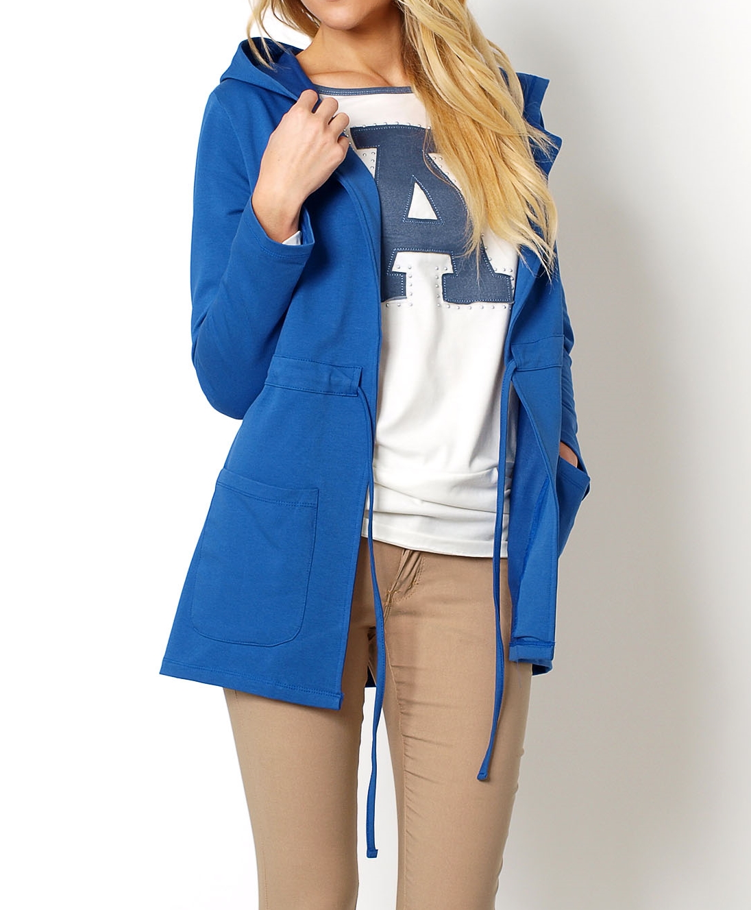 Dresowa narzutka z kapturem, w talii sznurek do regulacji i wiązania, z przodu kieszenie, dłuższy fason.Materiał 95% bawełna, 5% elastan.Modelka wzrost 175cm, na co dzień nosi S/M, rozmiar z prezentacji produktu uniwersalny.